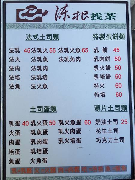 價位:土司40 60,法式土司 45 65,蛋餅 45 60,薄片土司25,飲料25 55。